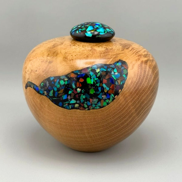 This spectacular urn was made from a gorgeous piece of black locust wood and turned on a wood lathe. Synthetic opal was inlayed into the natural inclusions to produce a gorgeous geode effect.