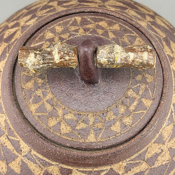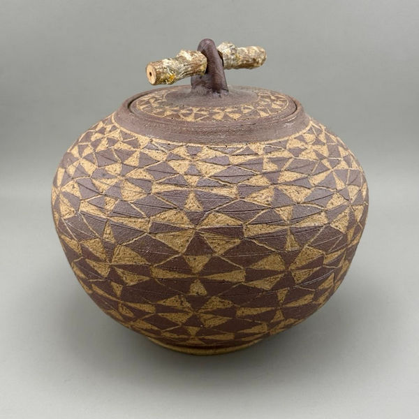 This handsome urn was hand-made by an artist in Bellingham, WA.  Iron oxide stain (applied before carving and firing) give it an earthy feel. Intricate carving and scoring create the illusion of a woven basket.  See “Product Description” below for notes from the artist.