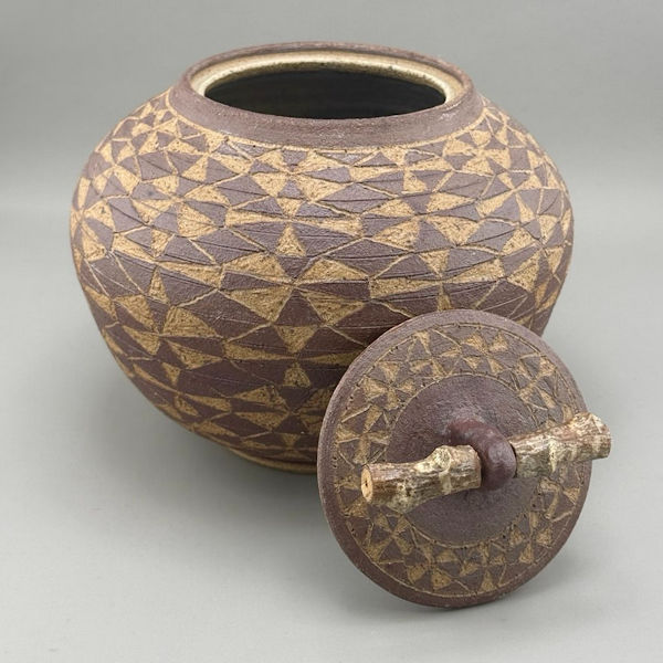 Note from the artist, Larry Richmond: “My current ceramic work continues to show the influence of the Northern California Indian baskets and the time I spent working and teaching on the Hoopa Indian Reservation for the past twenty five years. Almost every culture has passed through a period of technological change from making woven baskets to pottery. The work that I am doing now explores that transition. Using contemporary interpretations of traditional basket shapes and designs, I am searching for a balance between woven materials and clay that is both natural and pleasing.”