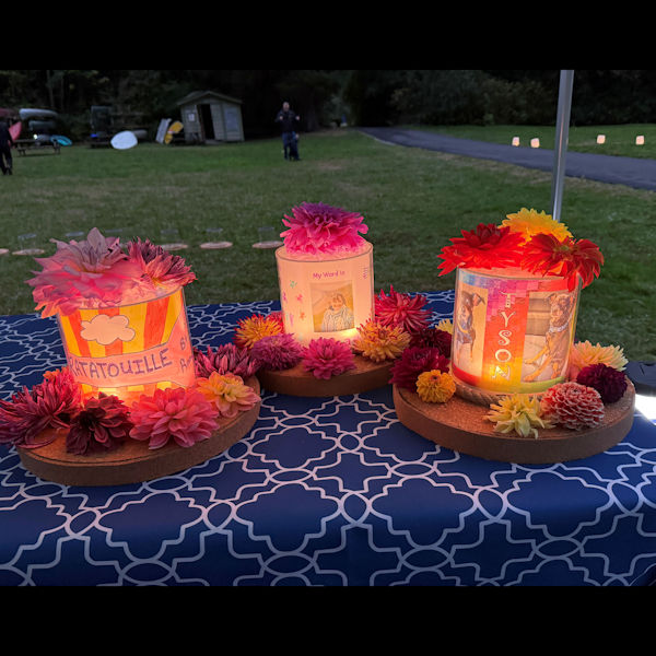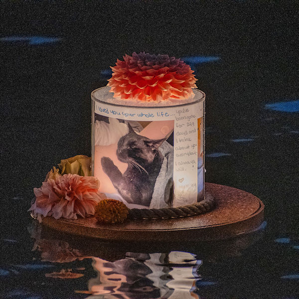 The lanterns consist of a floating base and a plexiglass cylinder top that fits snuggly onto the base. A 6″ x 18″ piece of transparent paper, decorated to honor one or more pets, rests on the inside edge of the plexiglass. LED candles are placed in the center (under the plexiglass).
