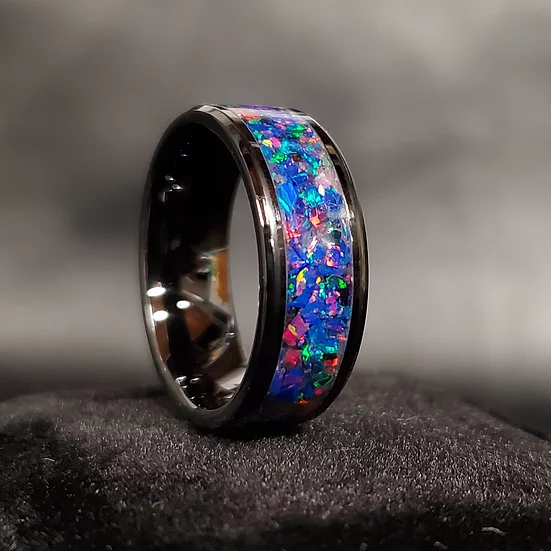 A small amount of your pet’s cremated remains, your choice of synthetic opal and a small amount of glow powder (blue, green, yellow or pink) are inlayed together into the center groove.