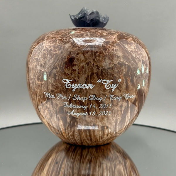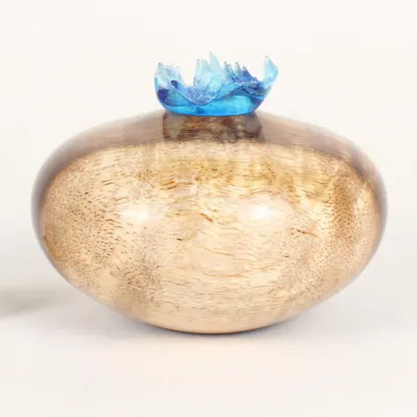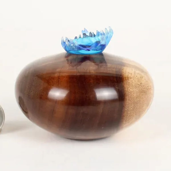 The wood is the star of the show, but this urn is extra special due to the screw-in topper made from a beautiful blue expoxy that was cast in a live edge burl mold.