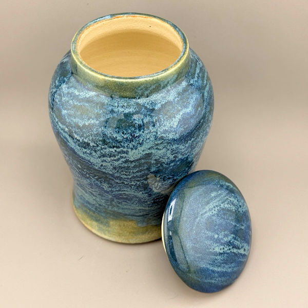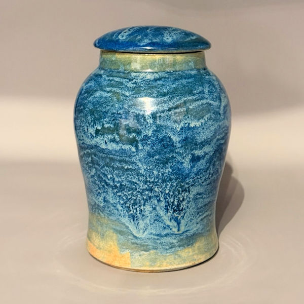 This gorgeous ceramic urn was handmade and glazed with several blues, replicating waves from a turquoise blue sea as they break against the warm sand.