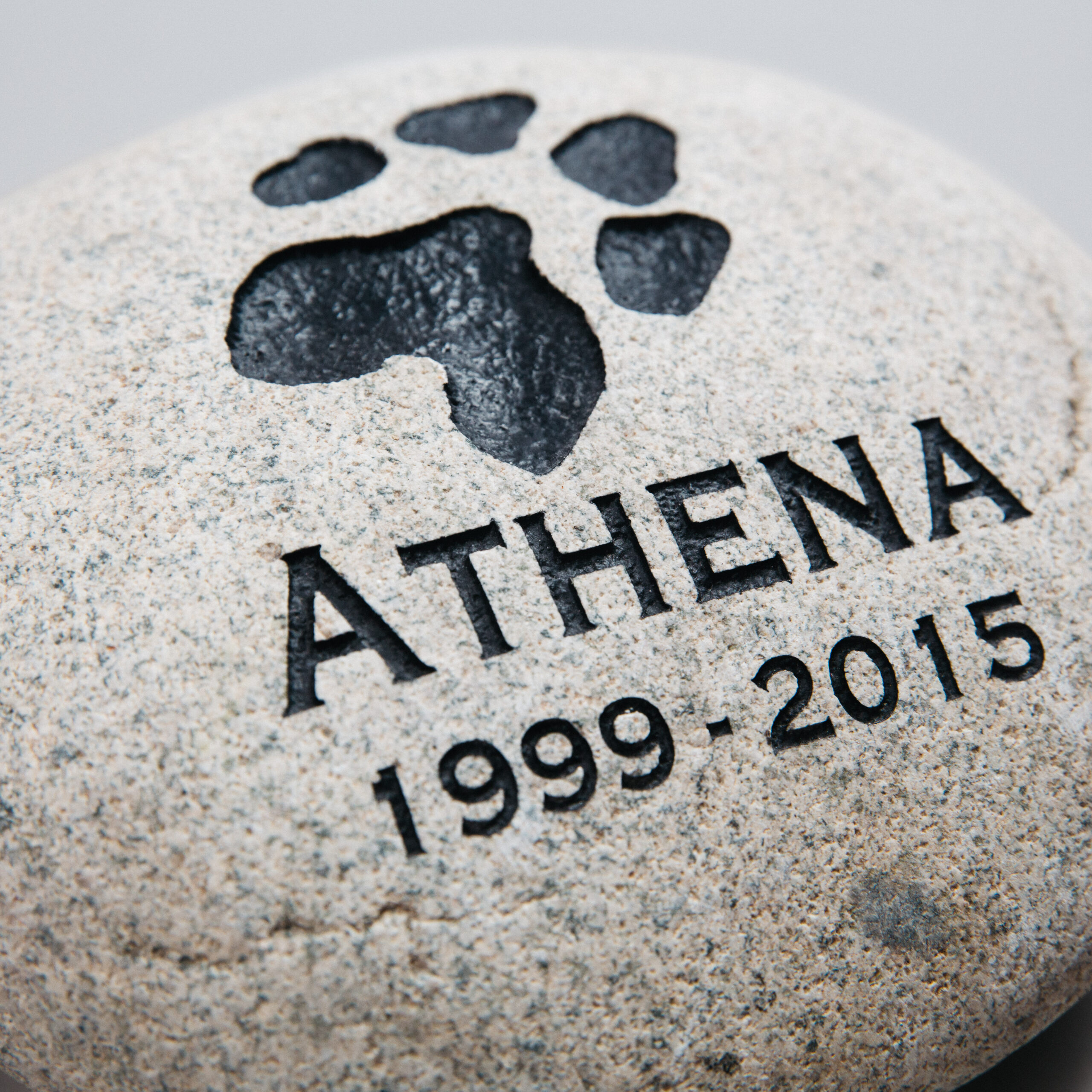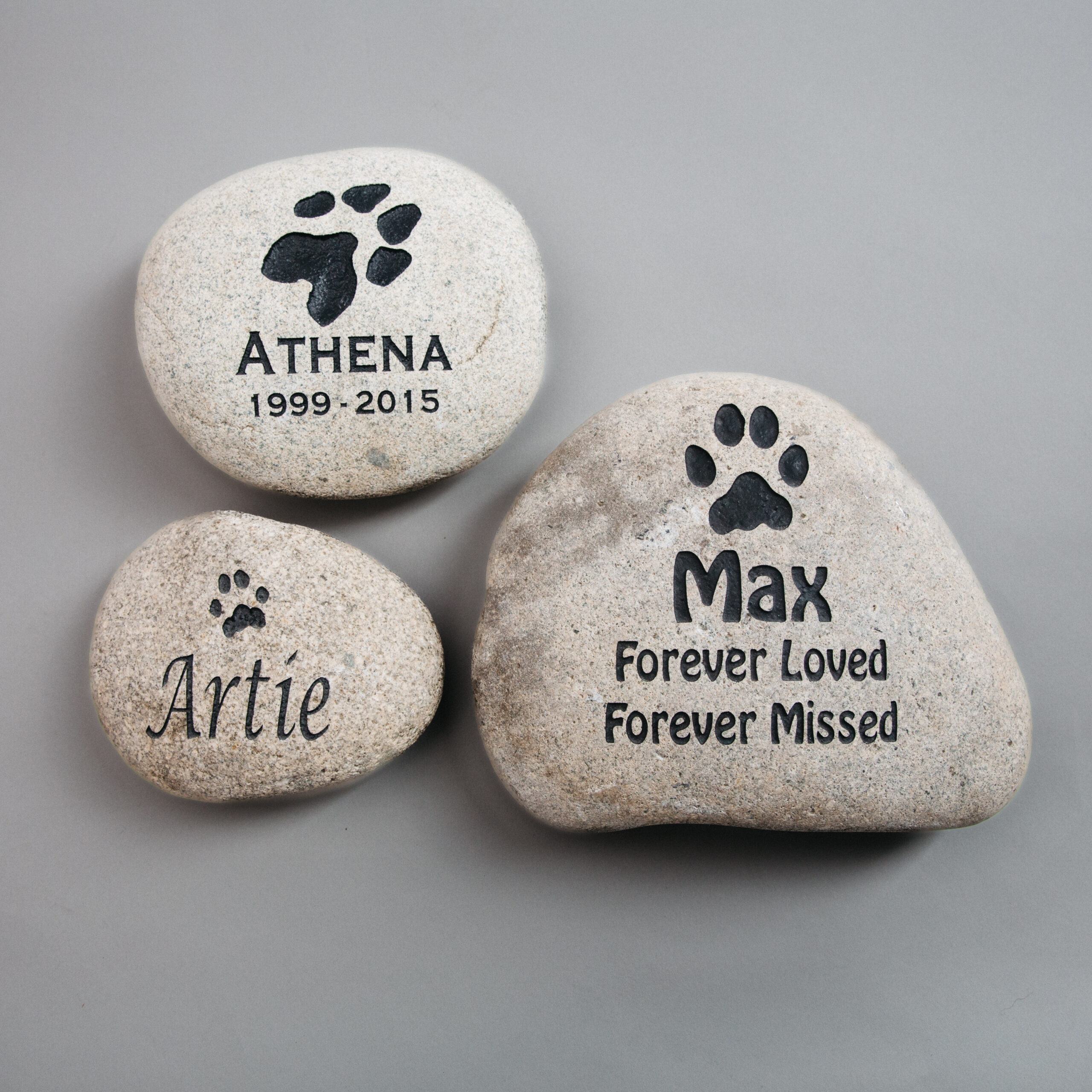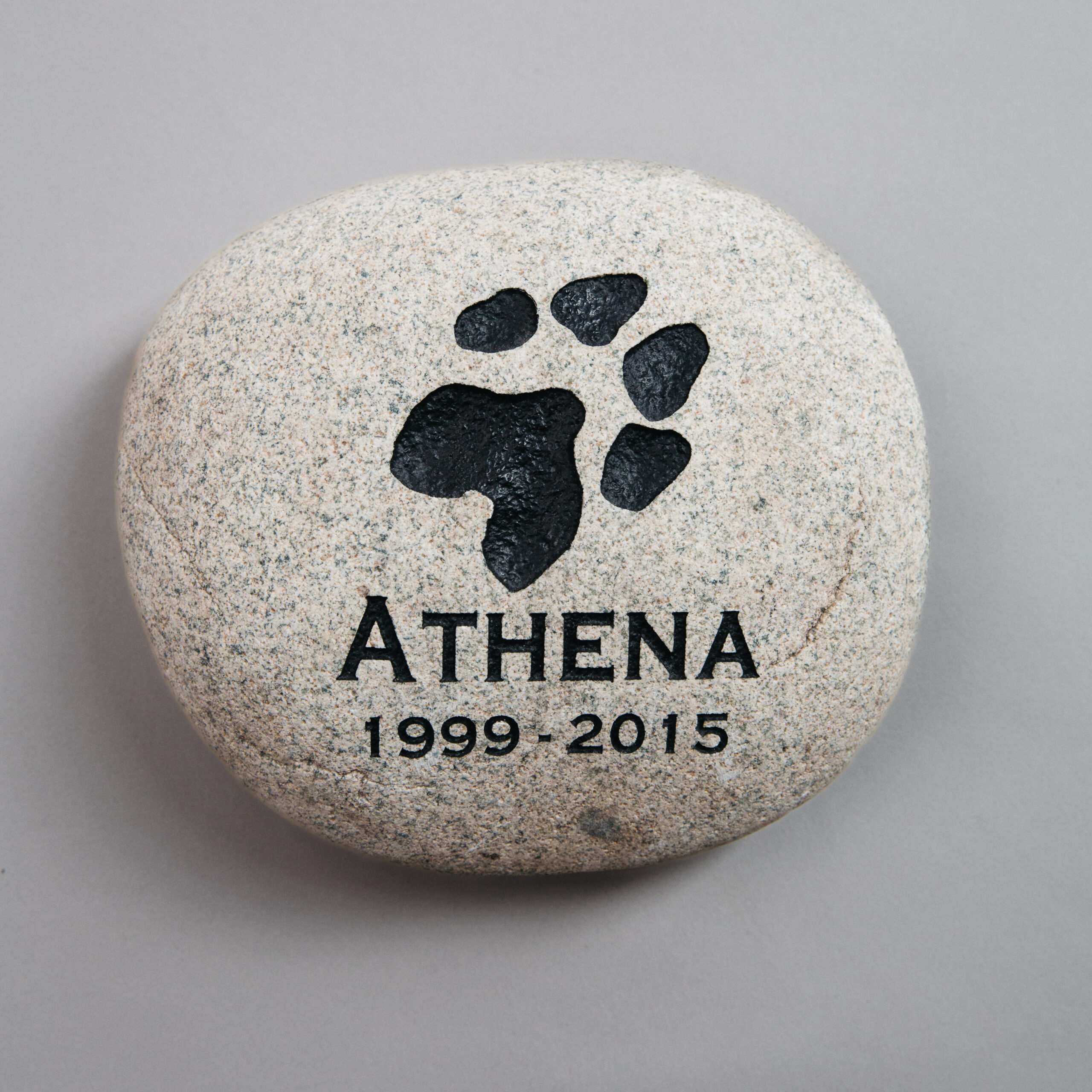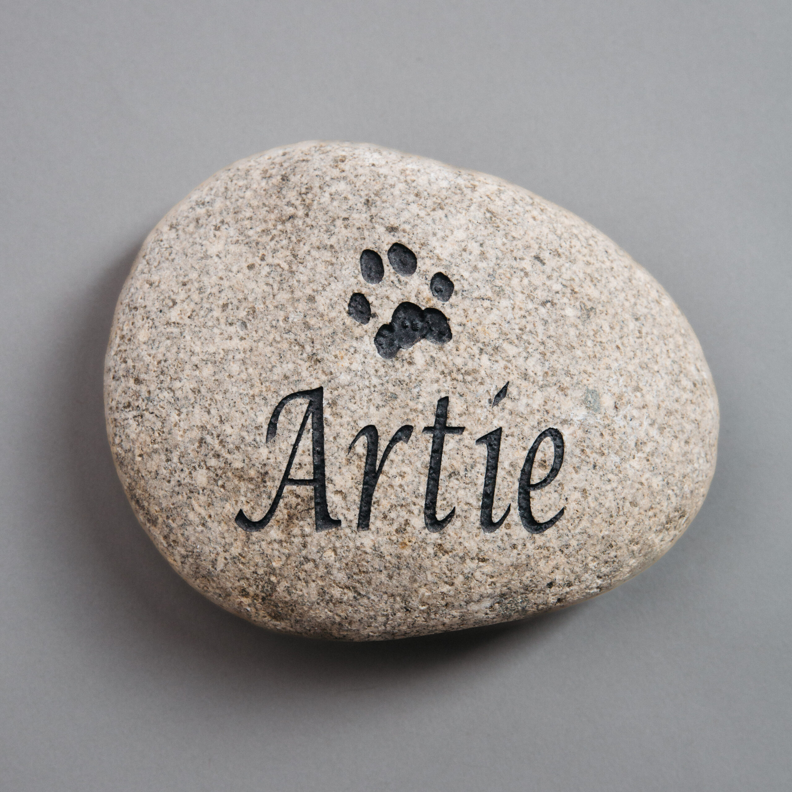 Your pet’s paw or nose ink print, or a generic image, is laser engraved onto a beautiful Colorado River stone, and then hand painted by Pacific Northwest artisans.