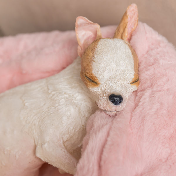 Your pet will be carefully posed to look as if they are sleeping. Silicone mold material is applied. The mold is then cast using a high-quality resin. The final casting is then painted by a talented local artist.  Based on your choice of colors, a pet bed (or pillow) and blanket are custom made. The result is sculpture-like memorial.