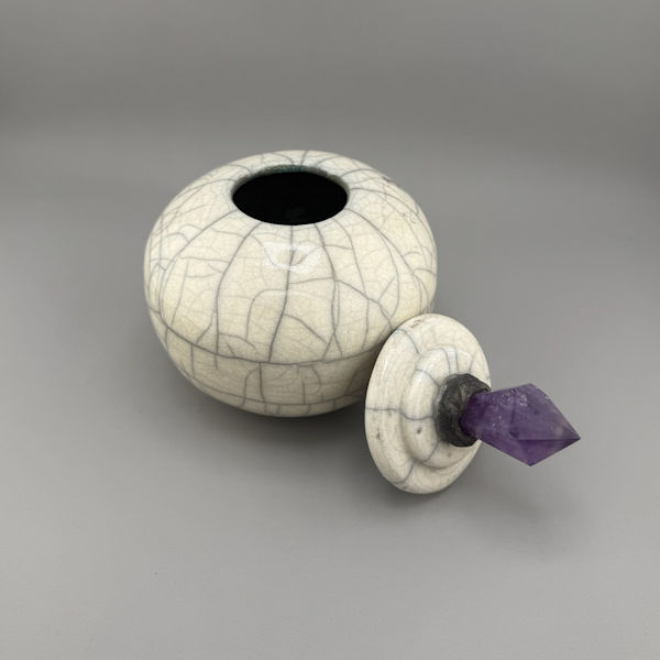 White Crackle Raku Pet Urn with Amethyst Handle (WC2)