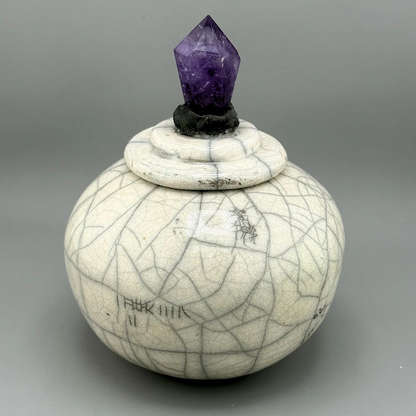 This white crackle raku urn is topped with a lovely healing* amethyst handle. It is a special piece of original art that you will cherish as the resting place for your pet’s cremated remains.