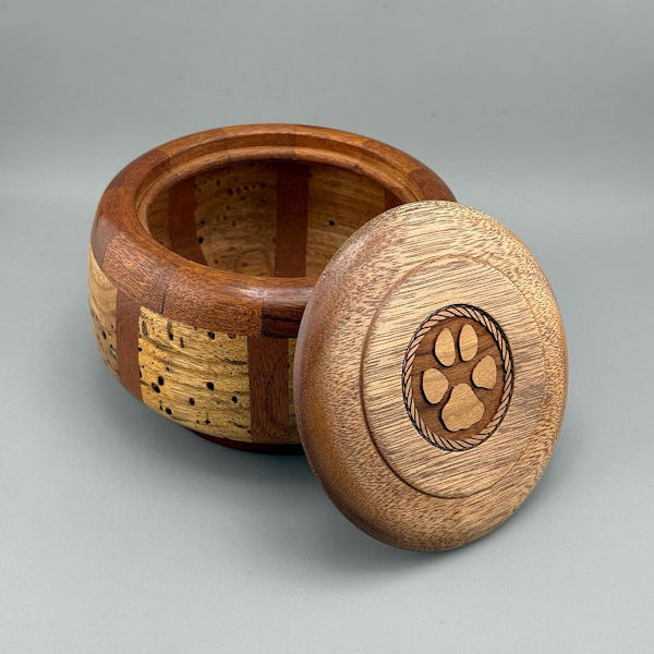 Engraved paw print medallion in lid may be replaced with a custom engraved medallion.